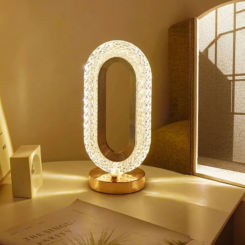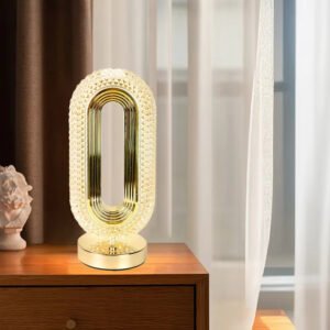 أباجورة طاولة بتصميم عصري فاخر، مصنوعة من زجاج كريستالي مزدوج الطبقات يمنحها عمقًا بصريًا أنيقًا وانعكاسًا جذابًا للإضاءة.