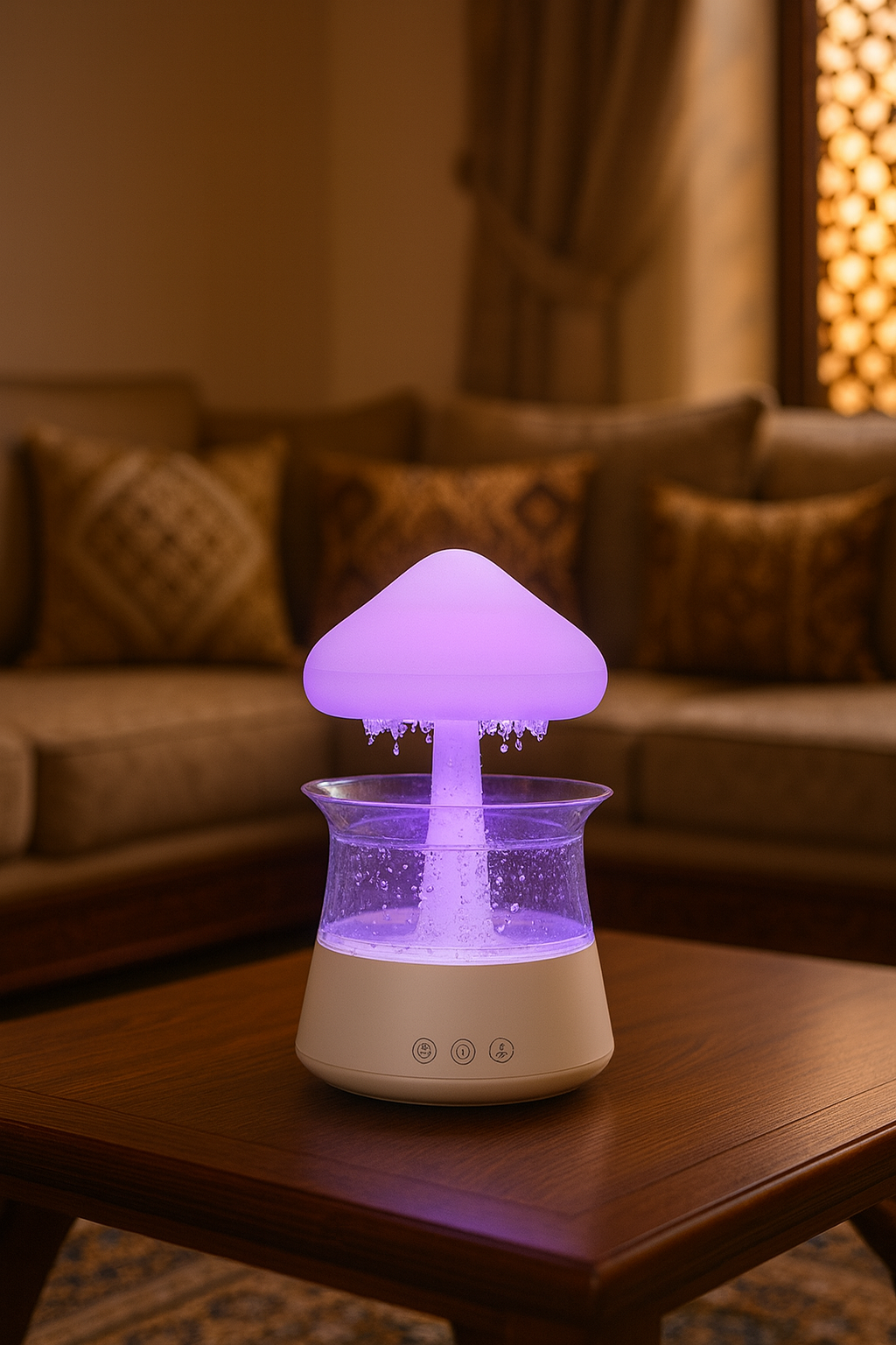 يشتغل بتقنية الرذاذ البارد عشان يعطي ترطيب لطيف وانتعاش طبيعي، ومع إضاءة LED متغيّرة تخلق جو مريح وجذاب ✨