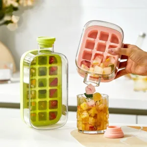 املأ القالب بالفواكه أو العصير أو الليمون والنعناع، ادخّله الفريزر… وبعد ما يجمد؟ مجرد ضغطة بسيطة على الغطاء وتنزل المكعبات مباشرة في الكوب من الفتحة السفلية بدون لمس أو بعثرة!