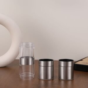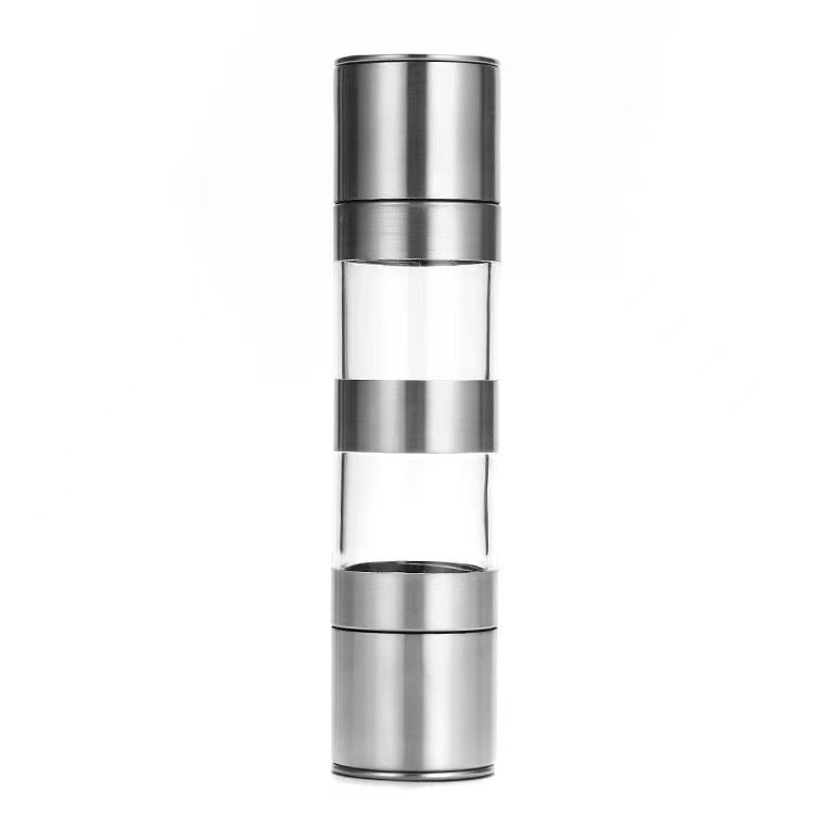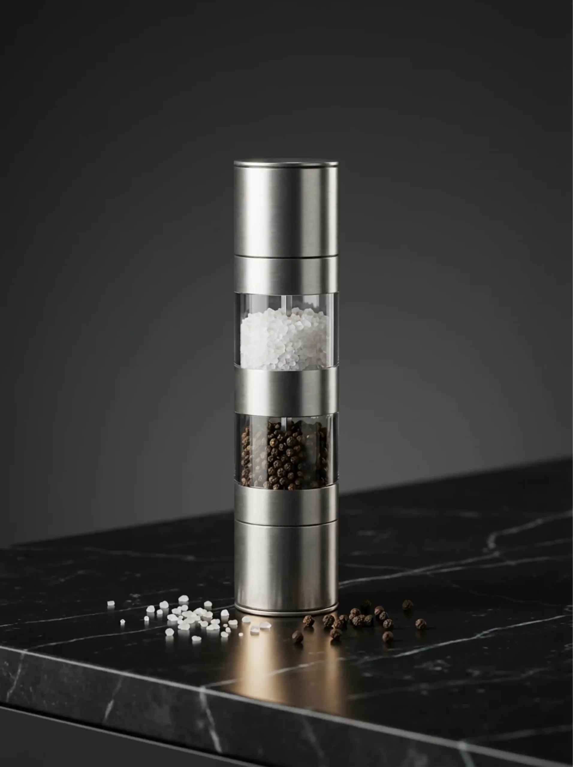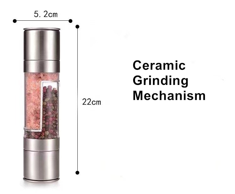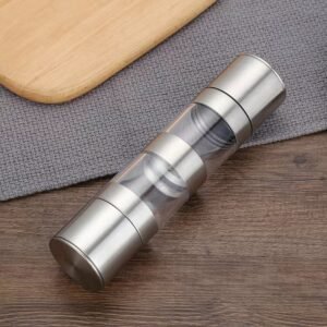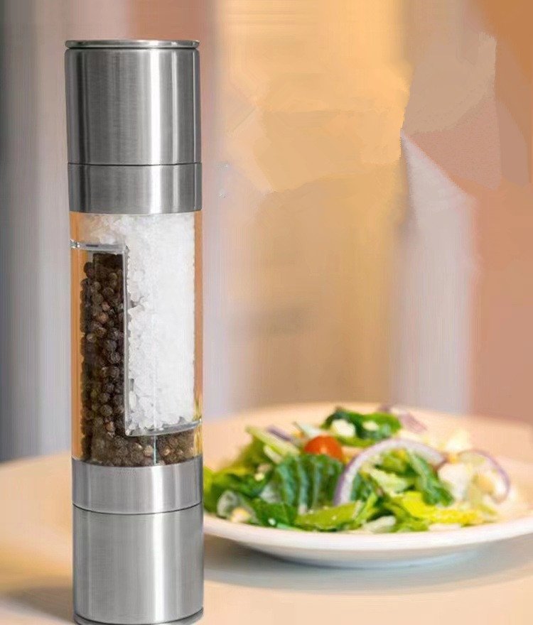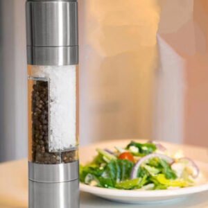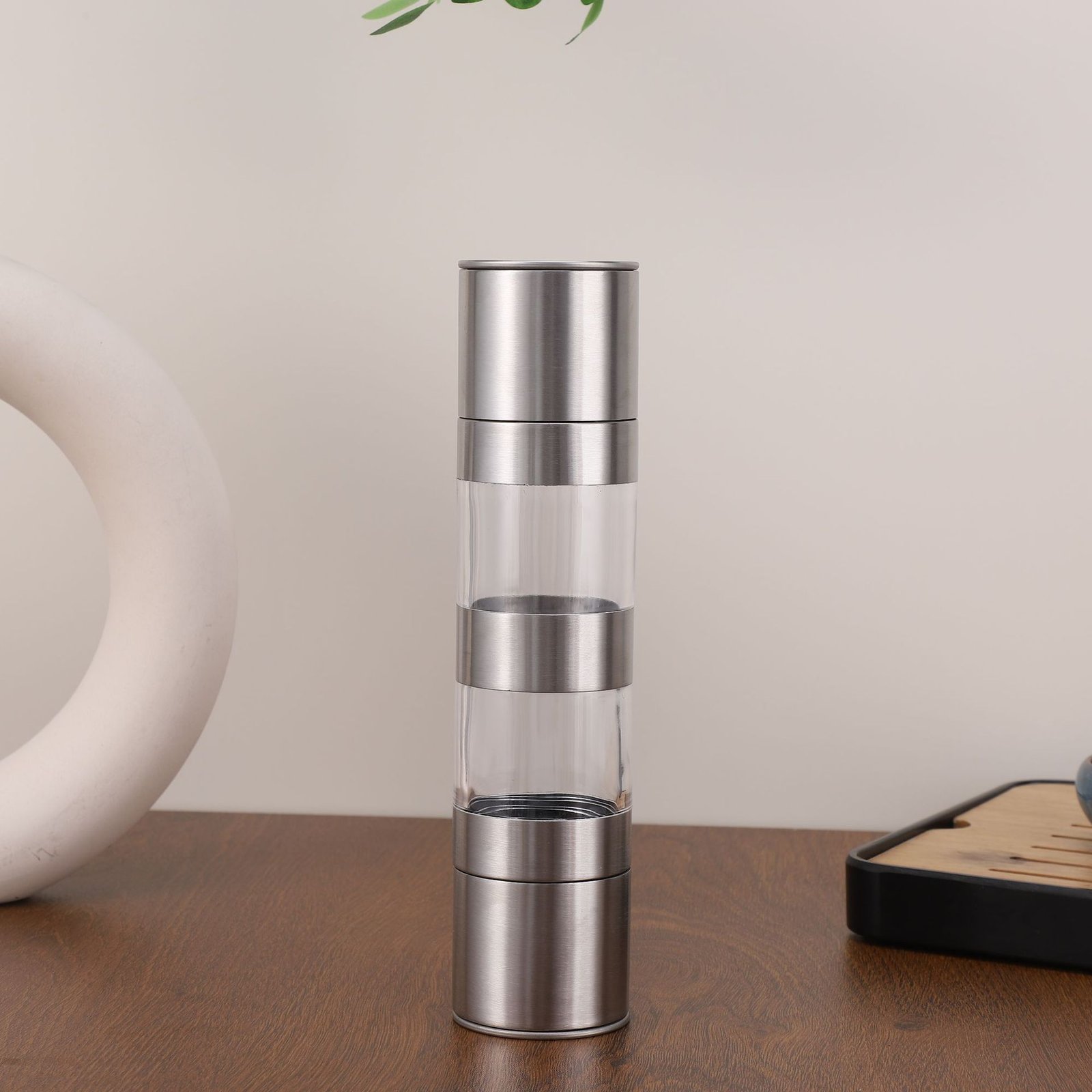 بدل ما يكون عندك مطحنتين، هذي القطعة تجمع الاثنين في تصميم واحد أنيق من الستانلس ستيل يعطي فخامة على طاولة الأكل أو المطبخ.