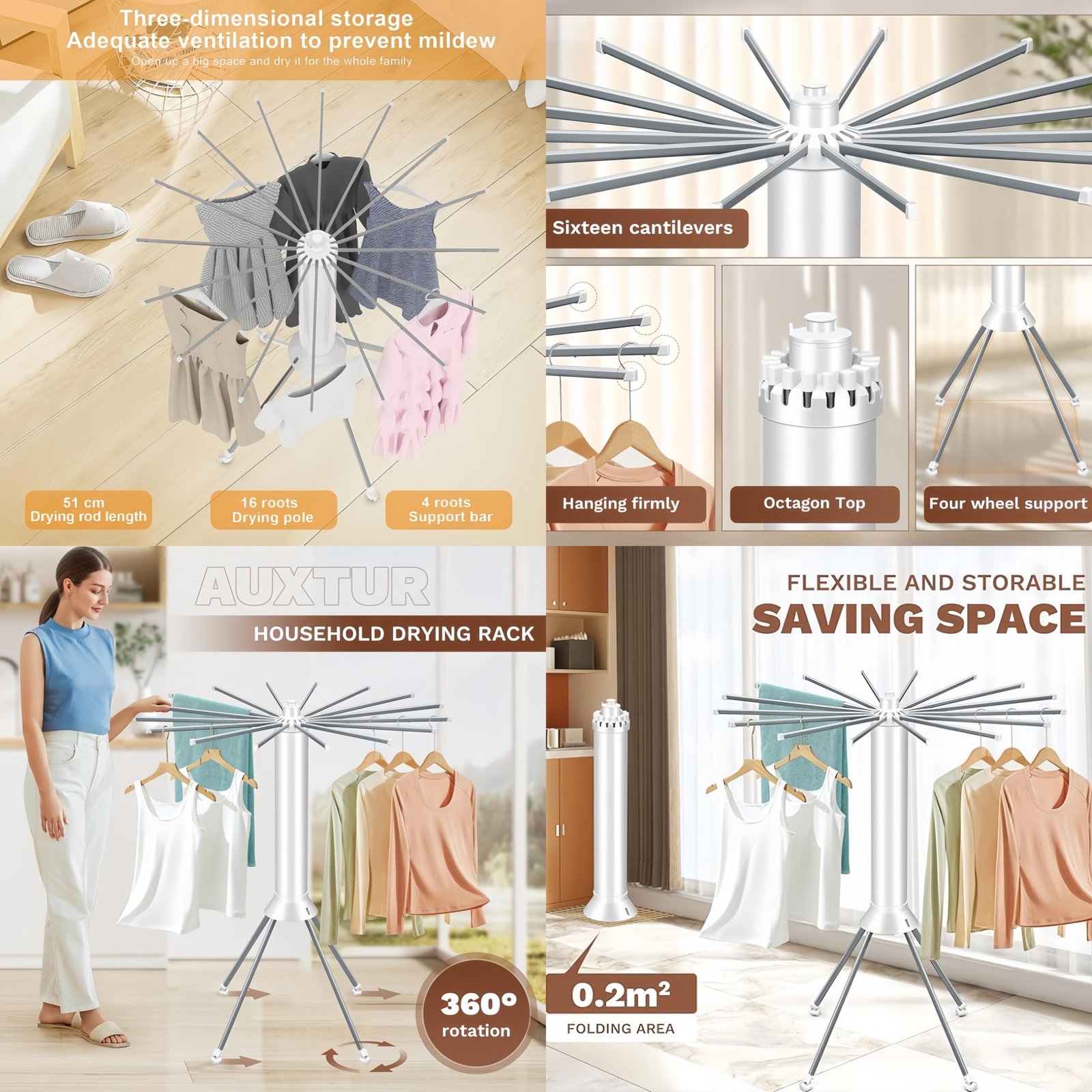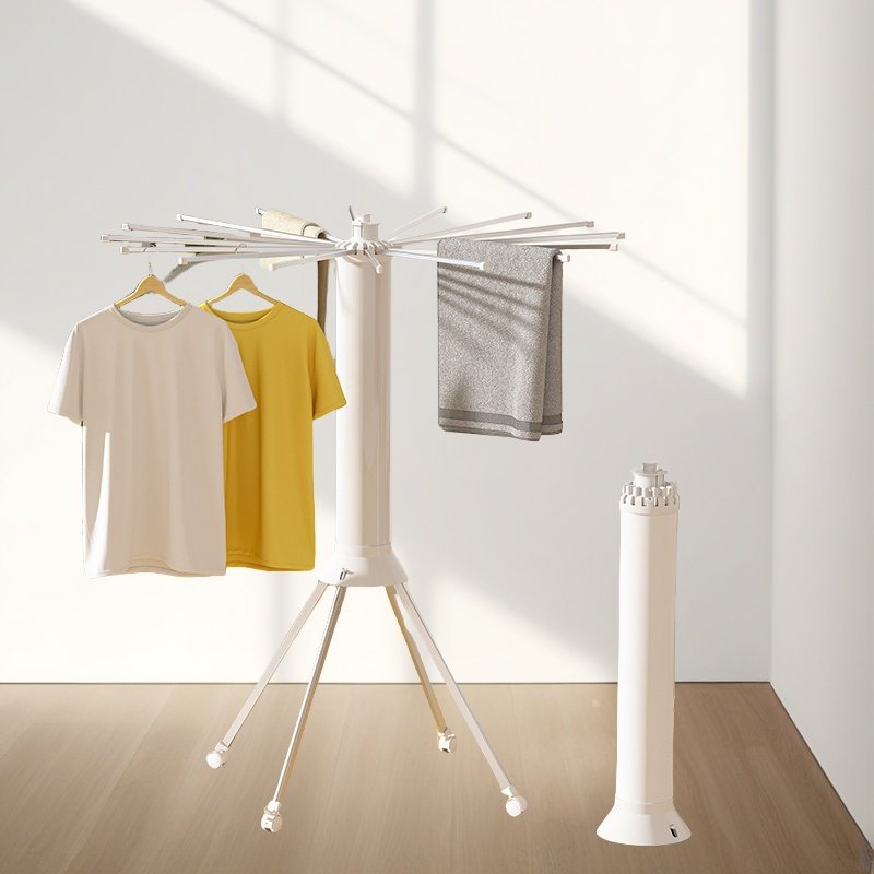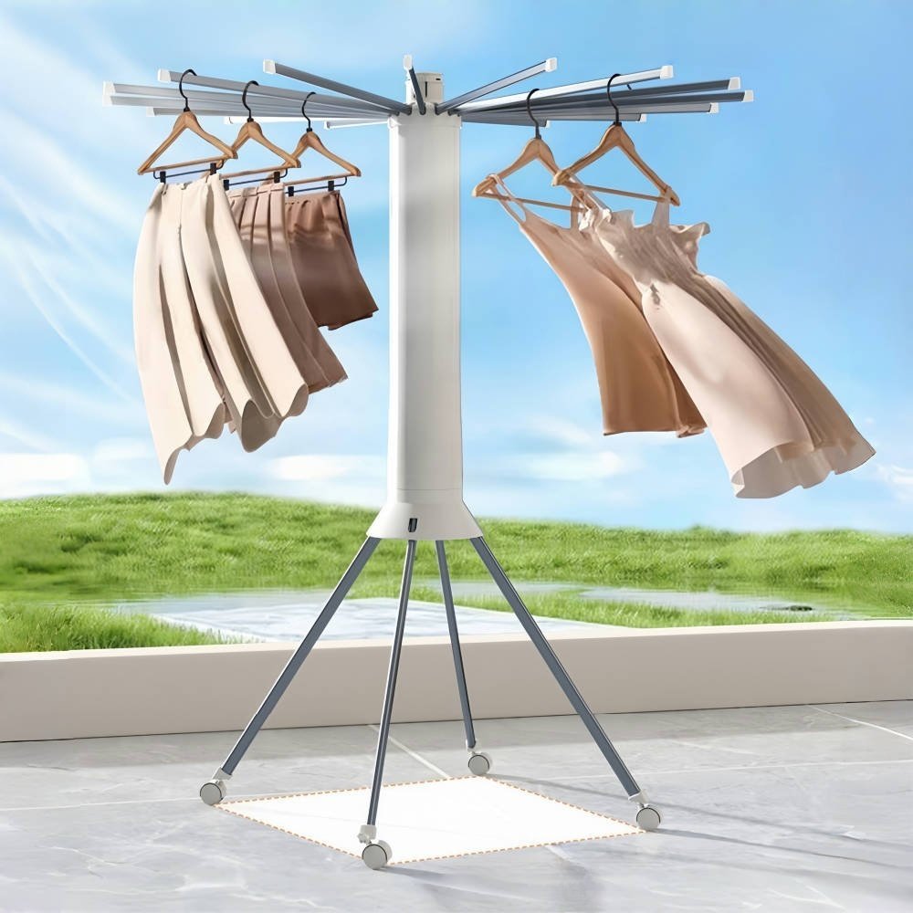 منشر ملابس عملي بتصميم عمودي ذكي، مزوّد بأذرع متعددة قابلة للفتح والدوران 360 درجة لتجفيف الملابس بشكل متوازن وسريع.