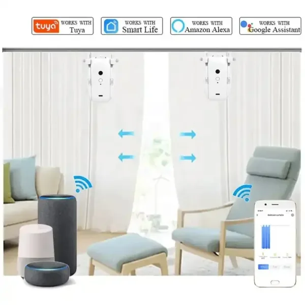 مفتاح ستائر أوتوماتيكي ذكي يعمل بالواي فاي يتم تركيبه على سكة الستائر للتحكم بها عن بُعد عبر تطبيق على الهاتف